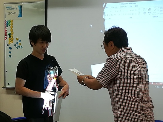 松永研に優勝カップと副賞ビール券を授与。(同窓会カップ)